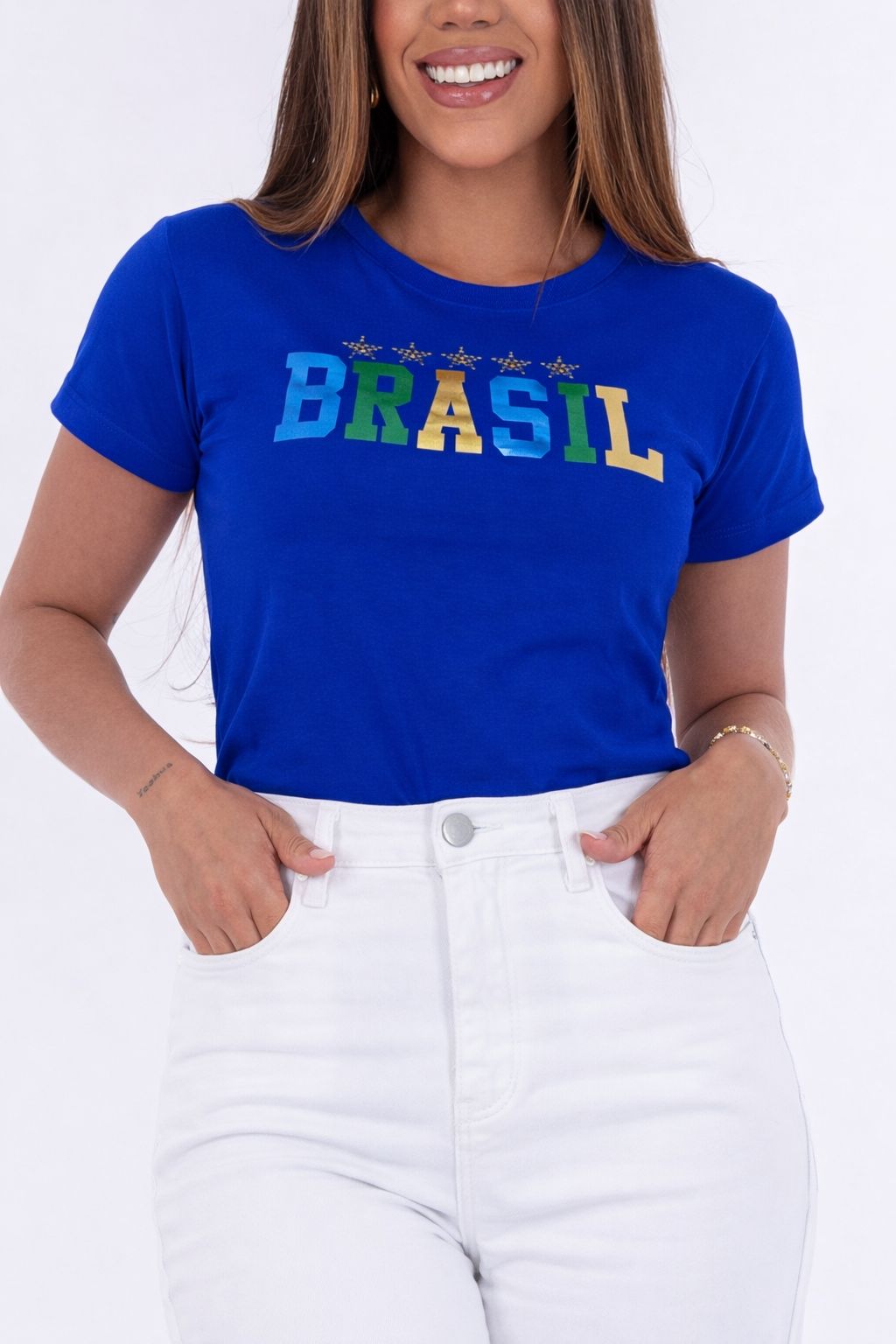 TSHIRT FEMININA ALGODÃO BRASIL APLICAÇÃO SEDA / AZUL BIC