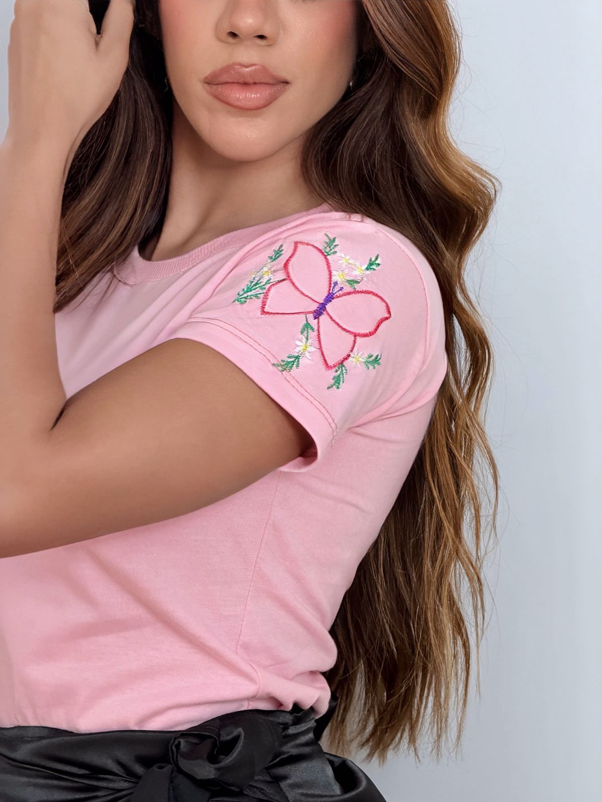 TSHIRT FEMININA ALGODÃO BORDADA NA MANGA BORBOLETA / ROSA BEBE
