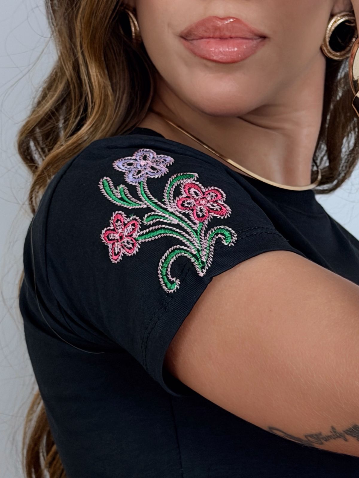 TSHIRT FEMININA ALGODÃO BORDADA NA MANGA 3 FLORES E RAMO / PRETA