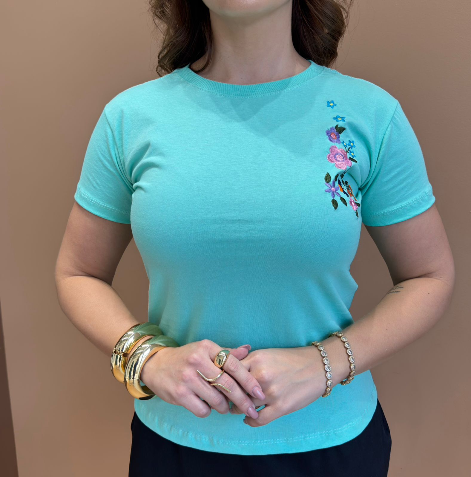 TSHIRT FEMININA ALGODÃO CANDY BORDADO RAMO NA LATERAL / VERDE AGUA