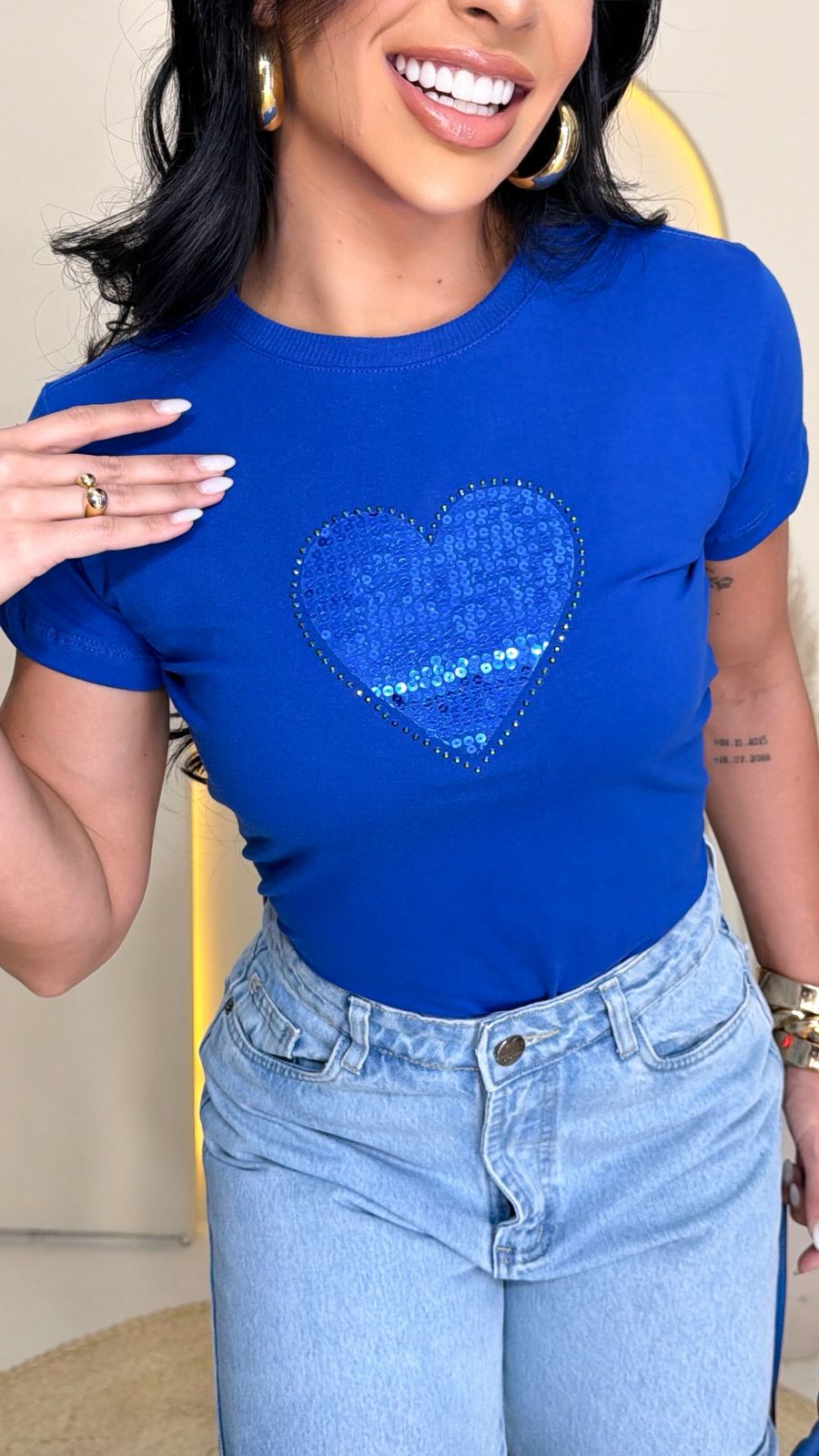 TSHIRT FEMININA ALGODÃO CORAÇÃO LANTEJOULA / AZUL BIC