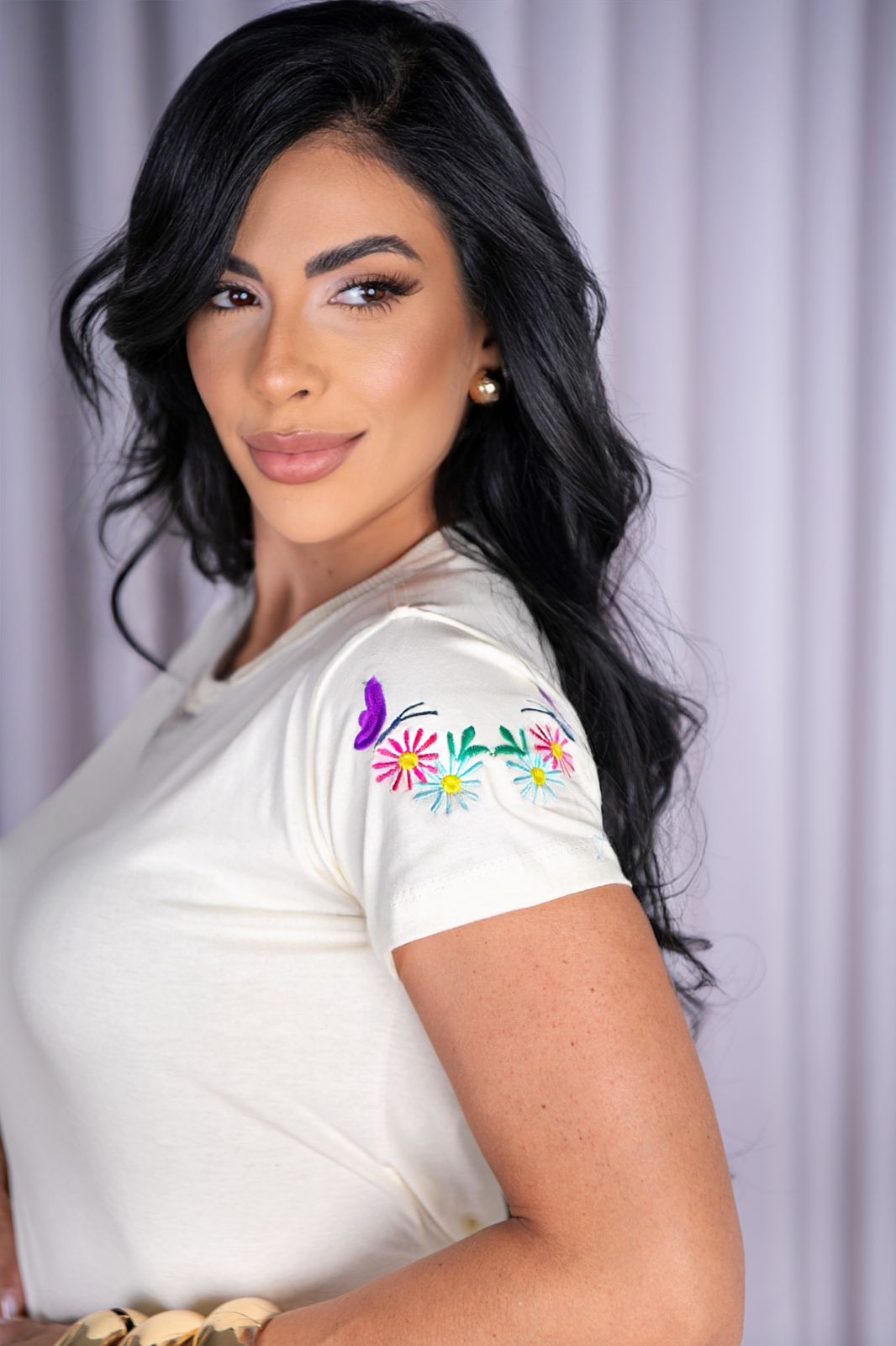 TSHIRT FEMININA ALGODÃO BORDADA NA MANGA FLORES E BORBOLETA LILAS / OFFWHITE