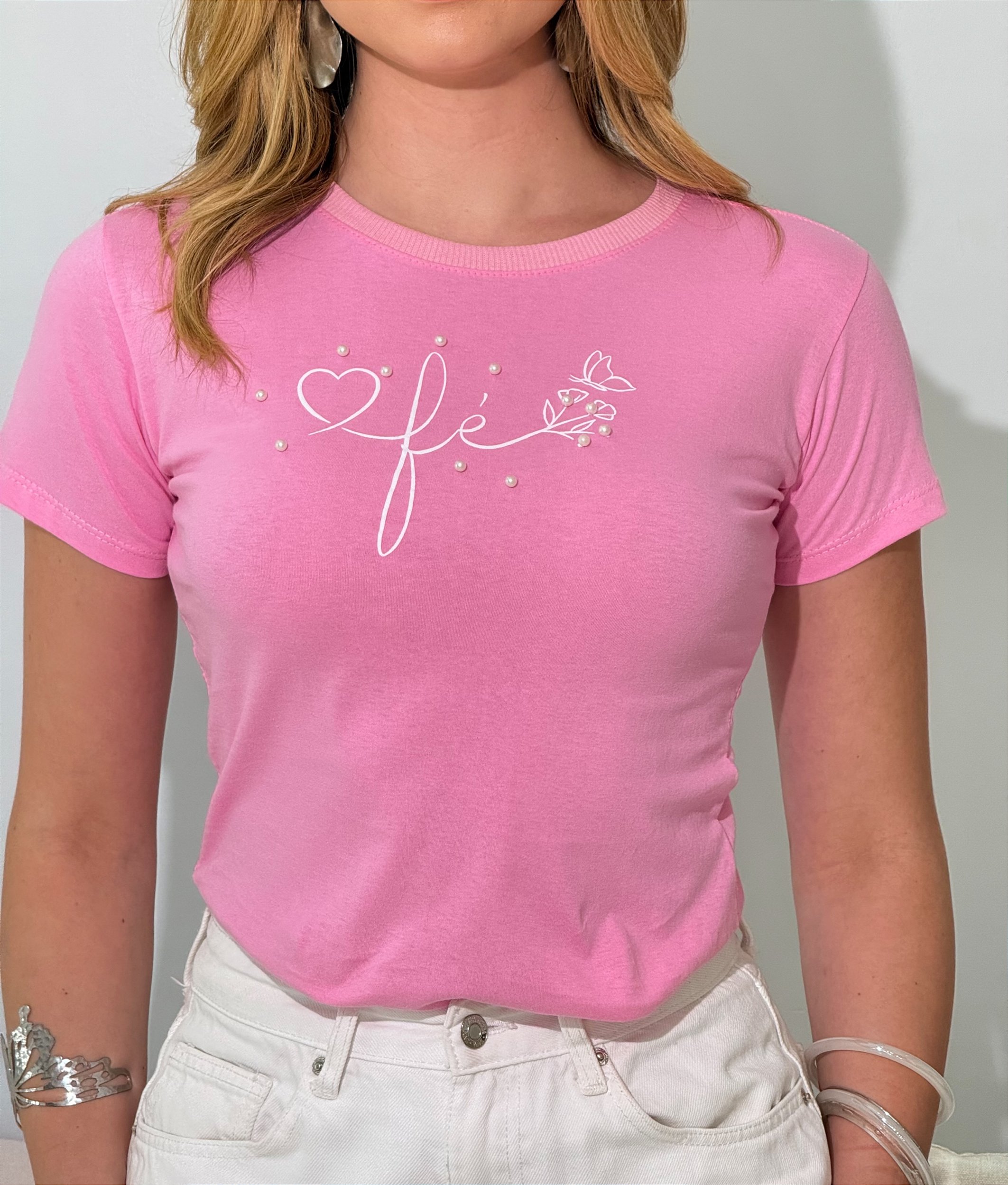 TSHIRT FEMININA ALGODÃO FÉ PÉROLAS / ROSA BEBE