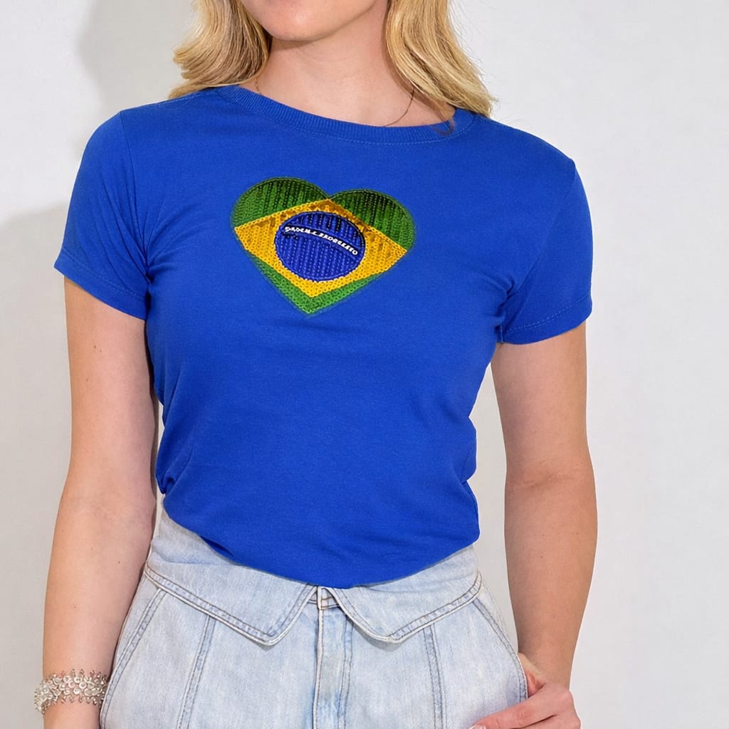TSHIRT FEMININA ALGODÃO CORAÇÃO BRASIL LANTEJOULA / AZUL