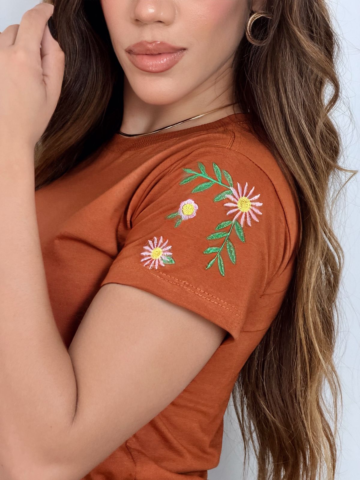 TSHIRT FEMININA ALGODÃO BORDADA NA MANGA FLOR E RAMO / TERRA COTA