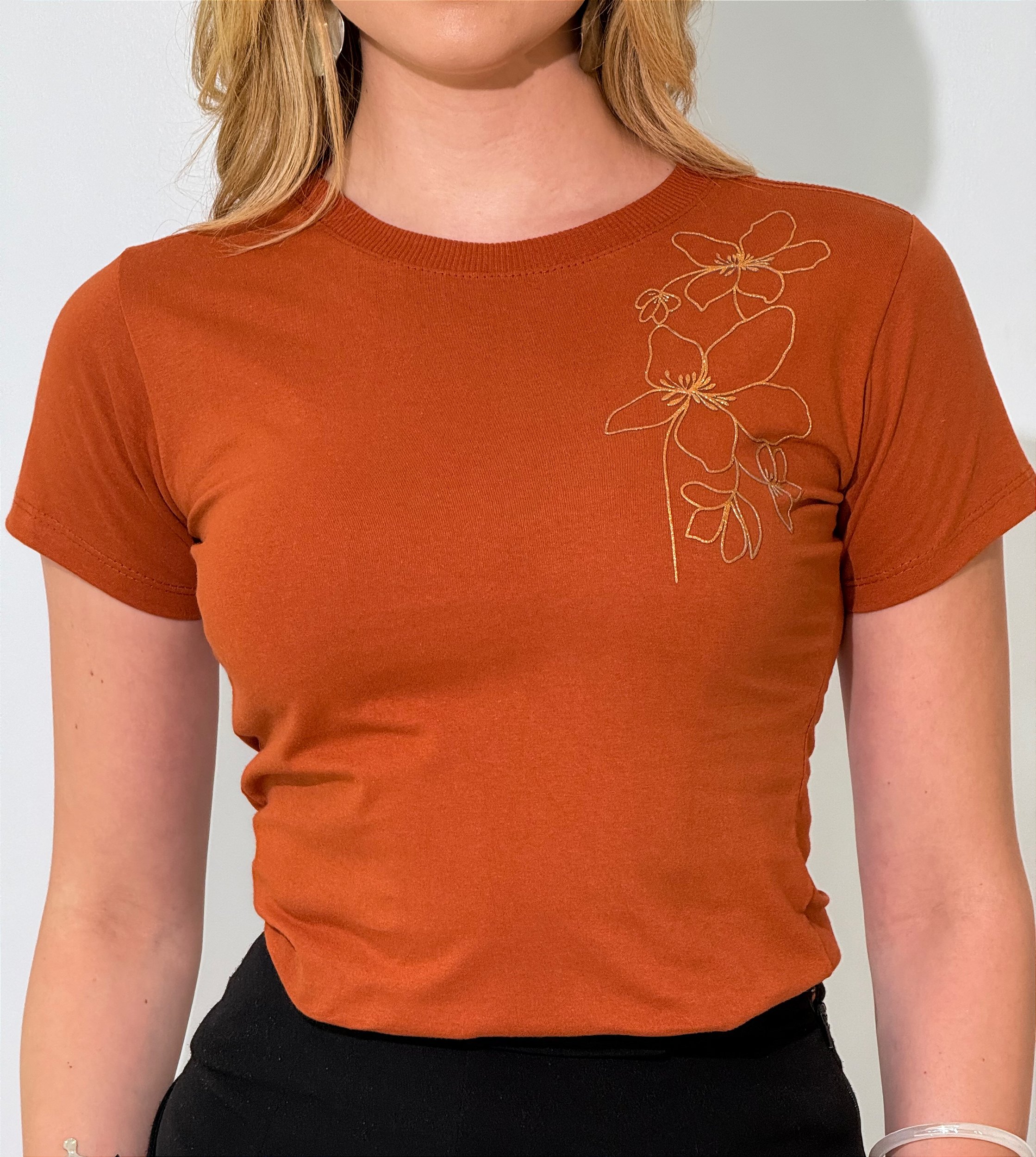 TSHIRT FEMININA ALGODÃO FLOR NA LATERAL / TERRA COTA