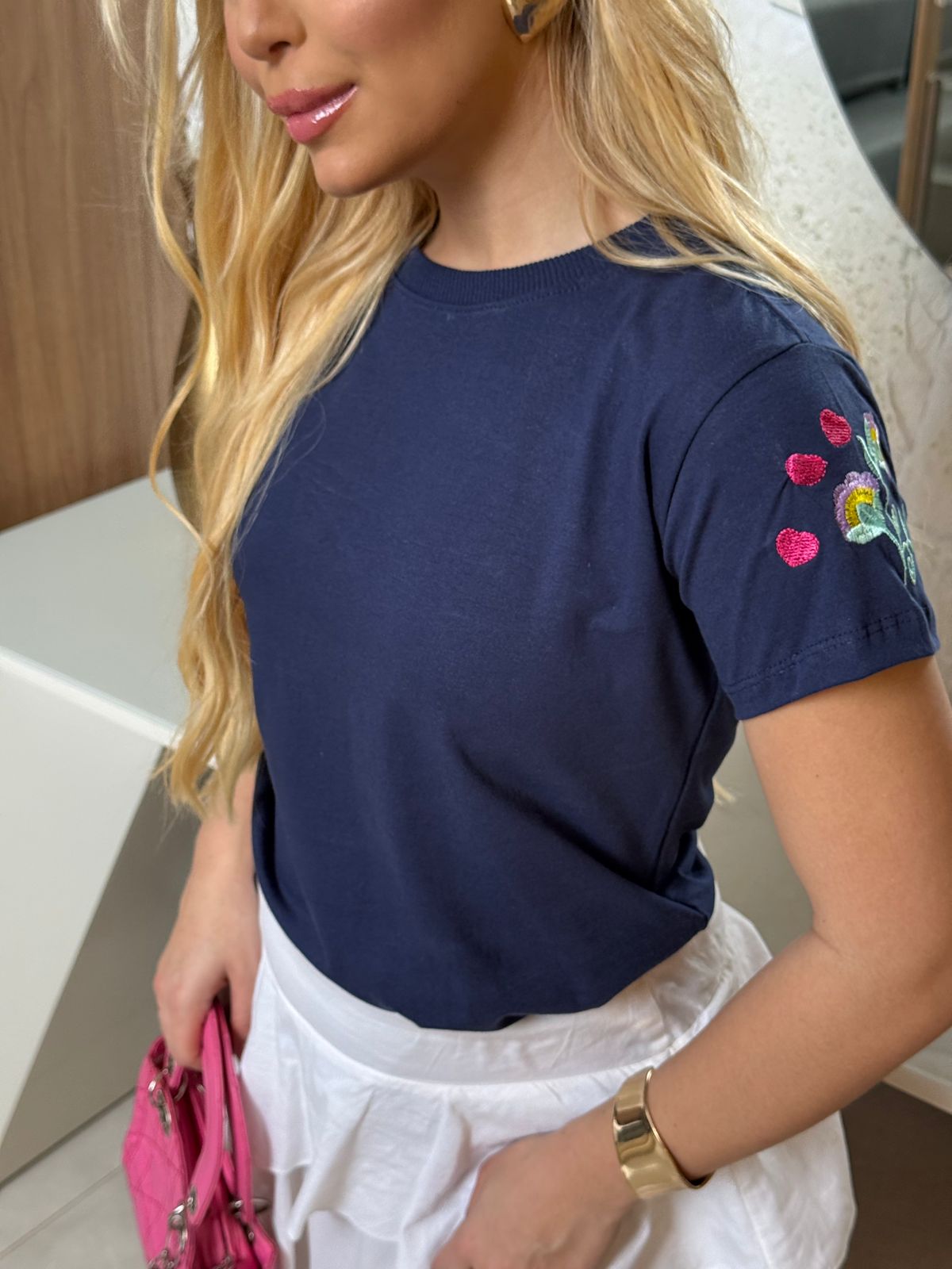 TSHIRT FEMININA ALGODÃO BORDADO NA MANGA FLOR E CORAÇÃO / AZUL MARINHO